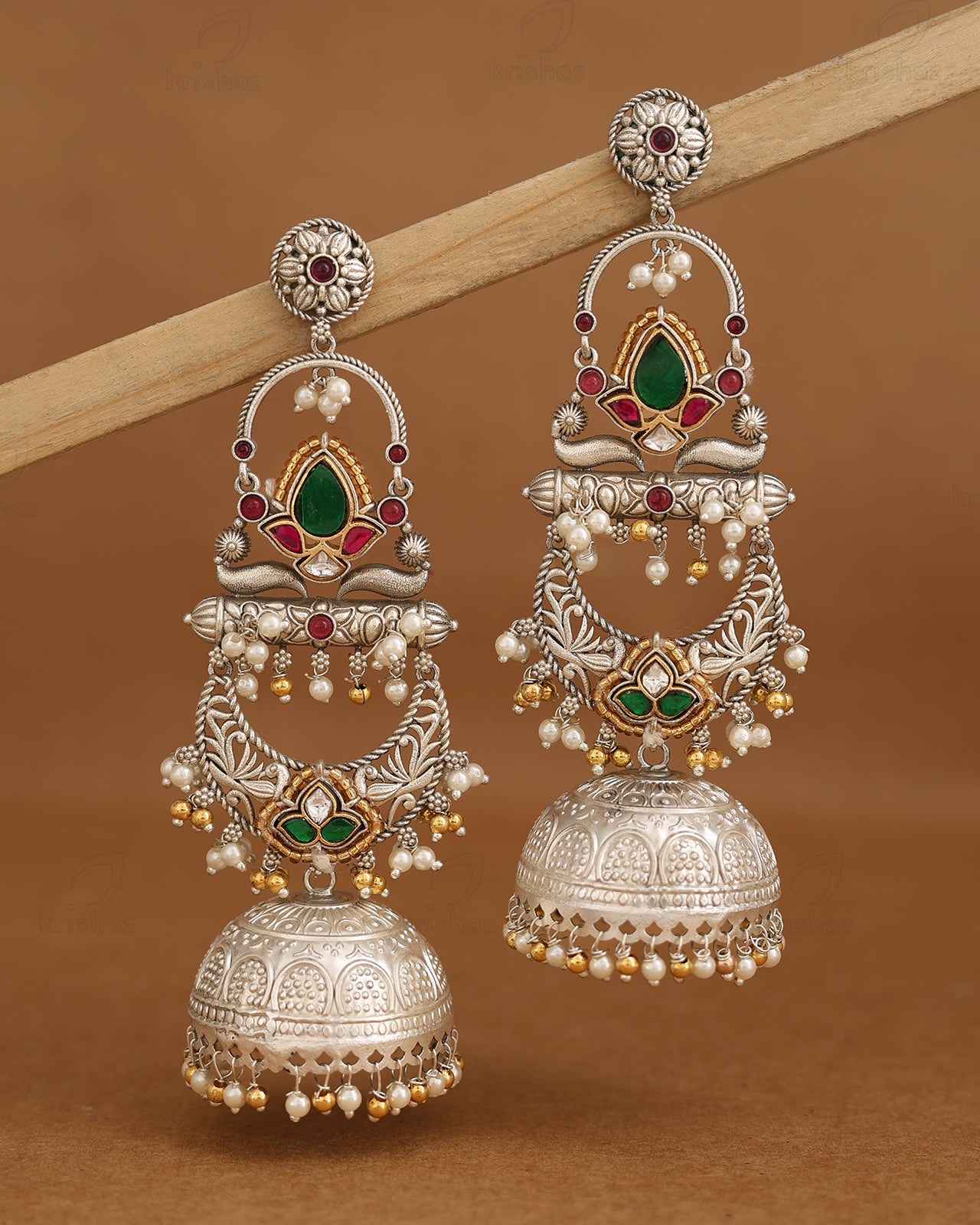 Elevate your traditional ensemble with the Shravanthi Jhumka Earrings, crafted in oxidized silver featuring a sophisticated two-tone design. Adorned with lustrous white pearls and vibrant colorful stones, these earrings blend ethnic charm with timeless elegance. Perfect for festive occasions, they offer a refined statement that complements both classic and contemporary styles.