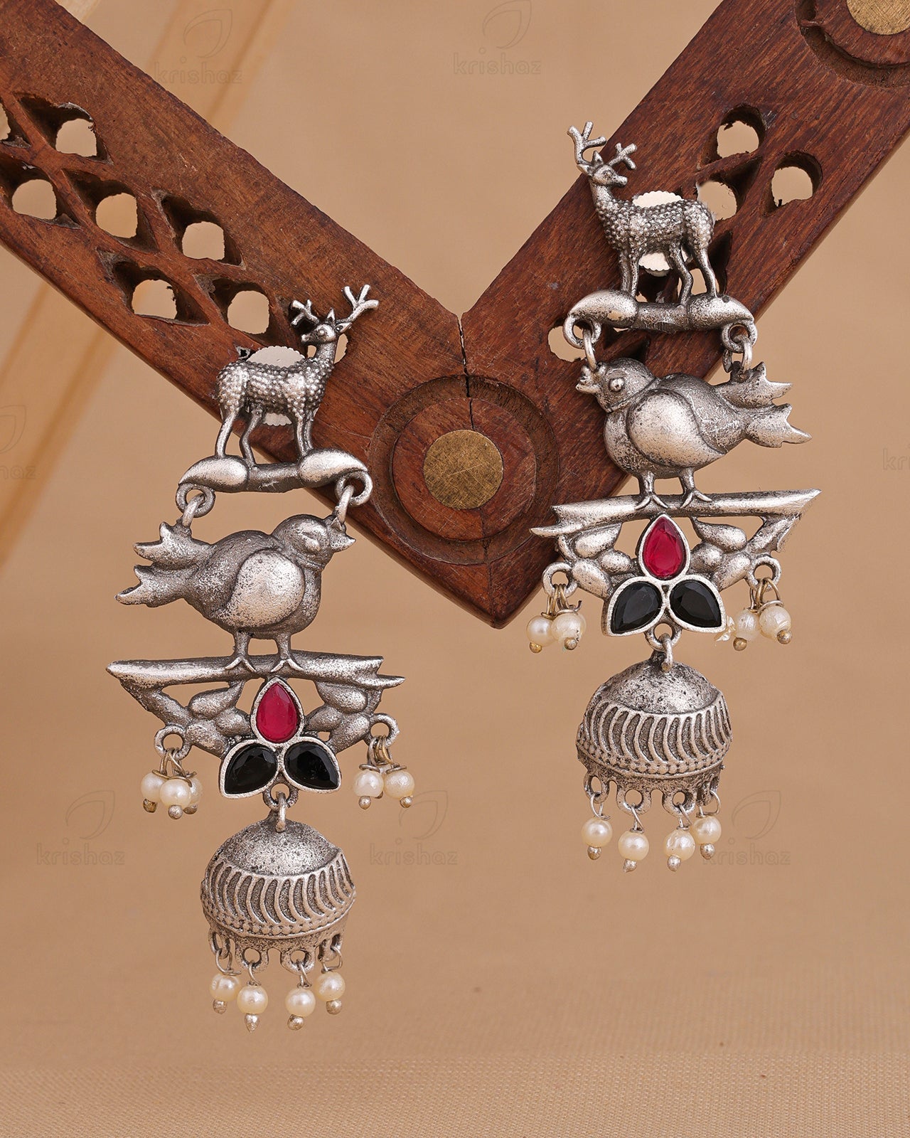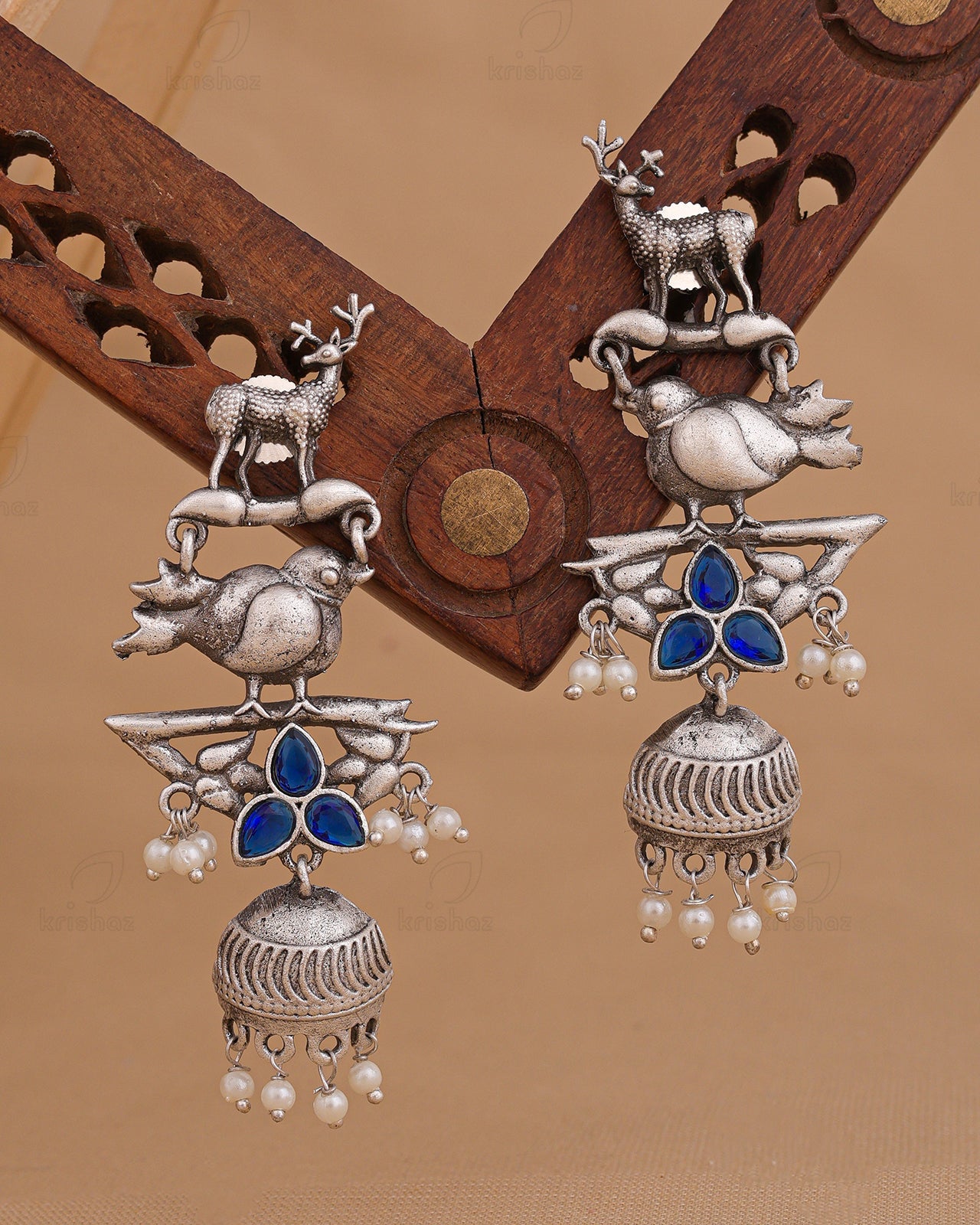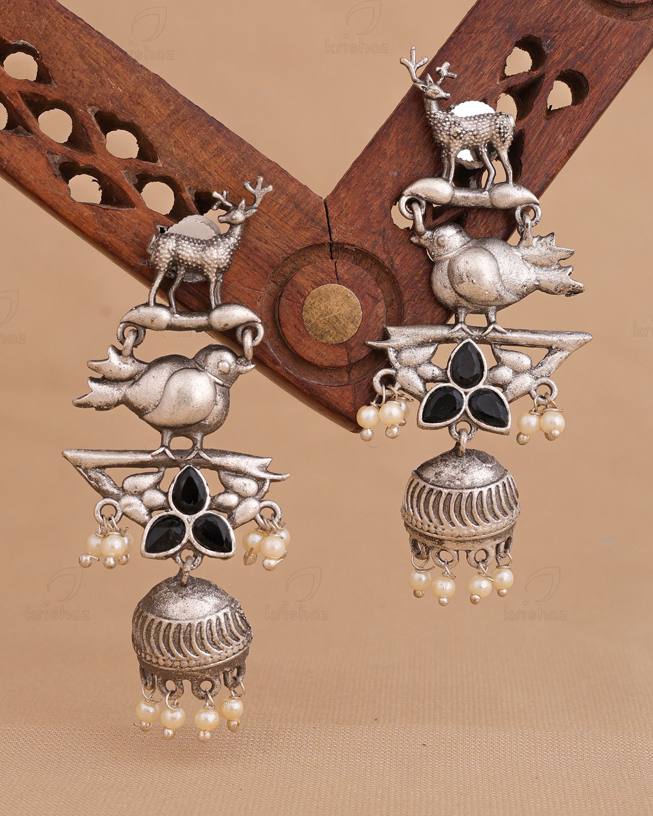 Instantly add a splash of chic to your ensemble with these classy KRISHAZ earrings. An eye-catching pair of earrings will give you additional excuses to dress up this festive Season. Our Silver Look Alike Earrings include delicate Eye catchy designs with tinkling pearl and stone trim that gives the look a Vibrant personality