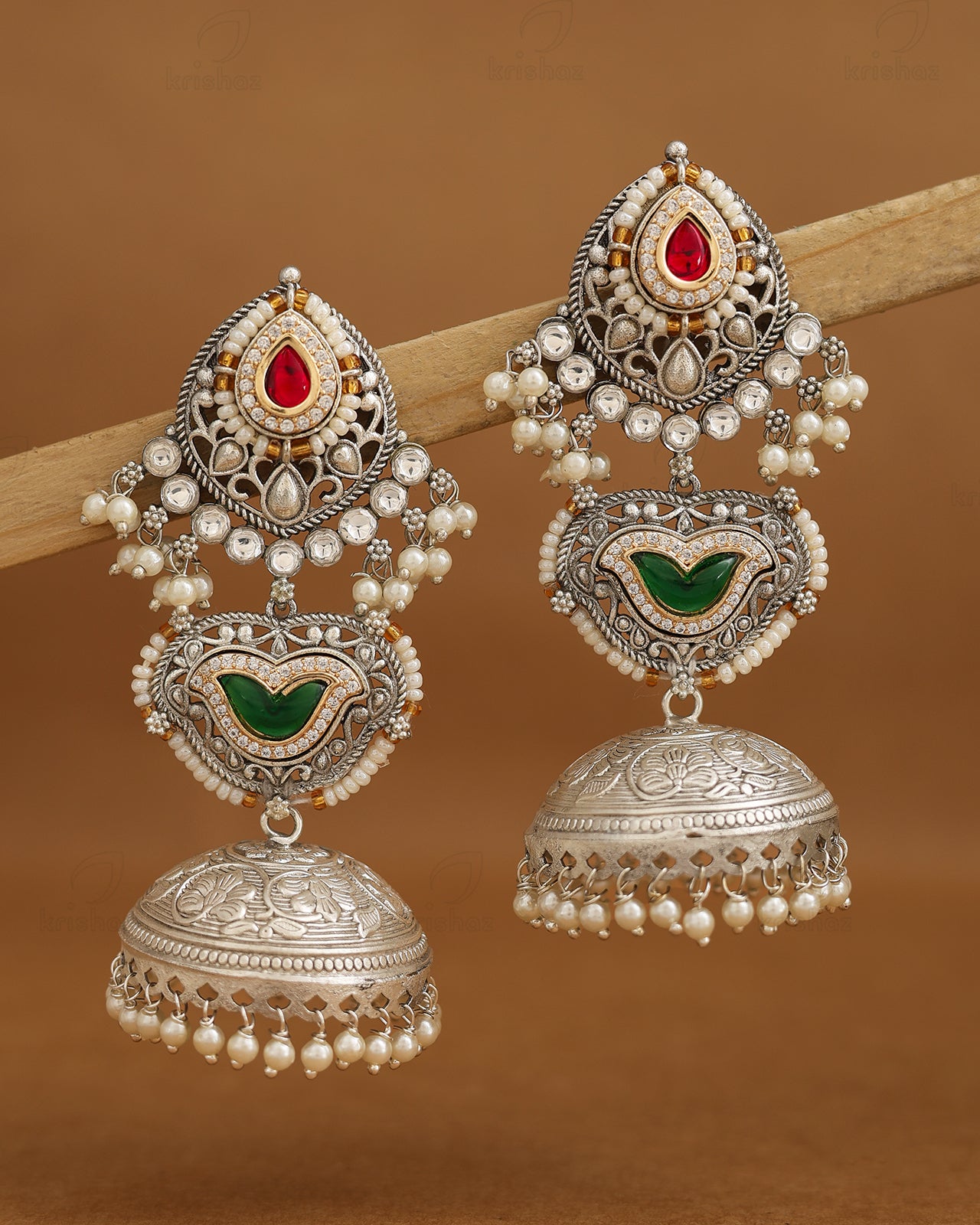 Elevate your ethnic collection with the Mridula Premium Jhumki Earrings, crafted in traditional oxidized silver. These earrings feature intricate designs adorned with white pearls, beads, and vibrant artificial stones, offering a unique blend of classic charm and colorful elegance. Perfect for adding a sophisticated touch to festive and cultural occasions, they embody expert craftsmanship and timeless style.